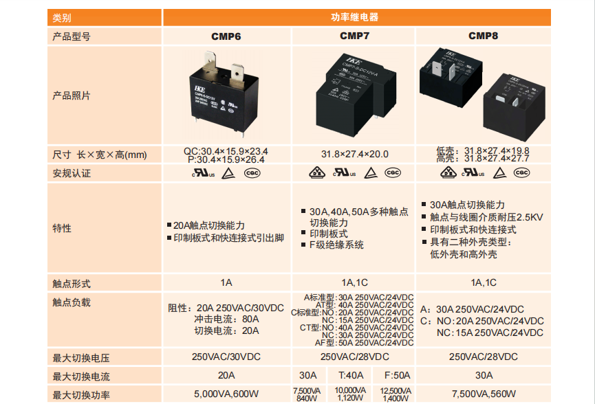 功率继电器 CMP6 特性: ■20A触点切换能力 ■印制板式和快连接式引出脚