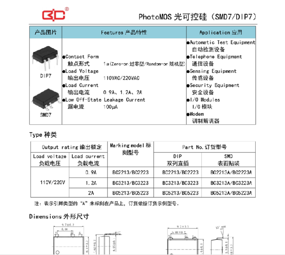 ● BC2213系列 触点形式:1a 输出电压:110/220VAC 输出电流:0.9A 封装形式:DIP7/SMD7 漏 电 流:100μA