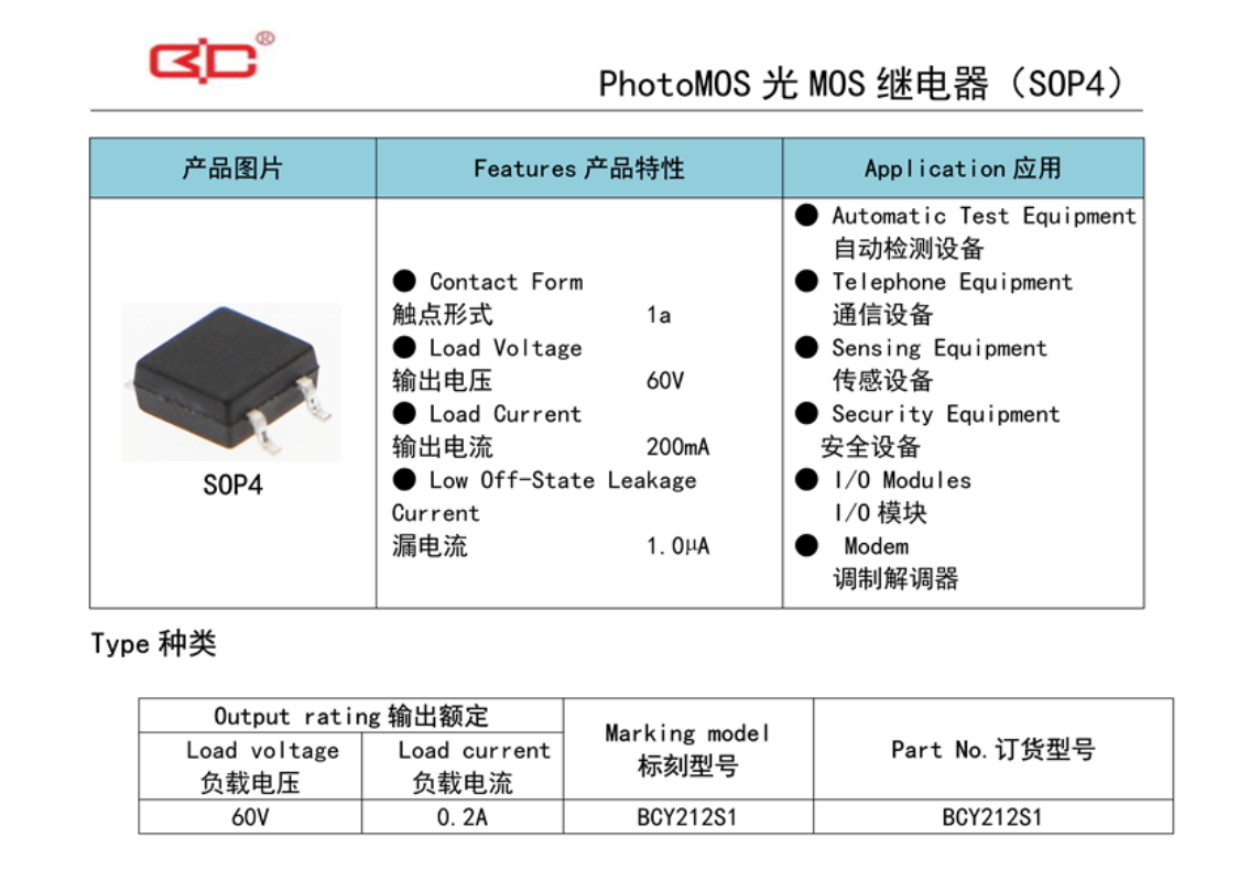 ● BCY212S1 触点形式:1a 输出电压:60V 输出电流:200mA 封装形式:SOP4 漏 电 流:1.0μA
